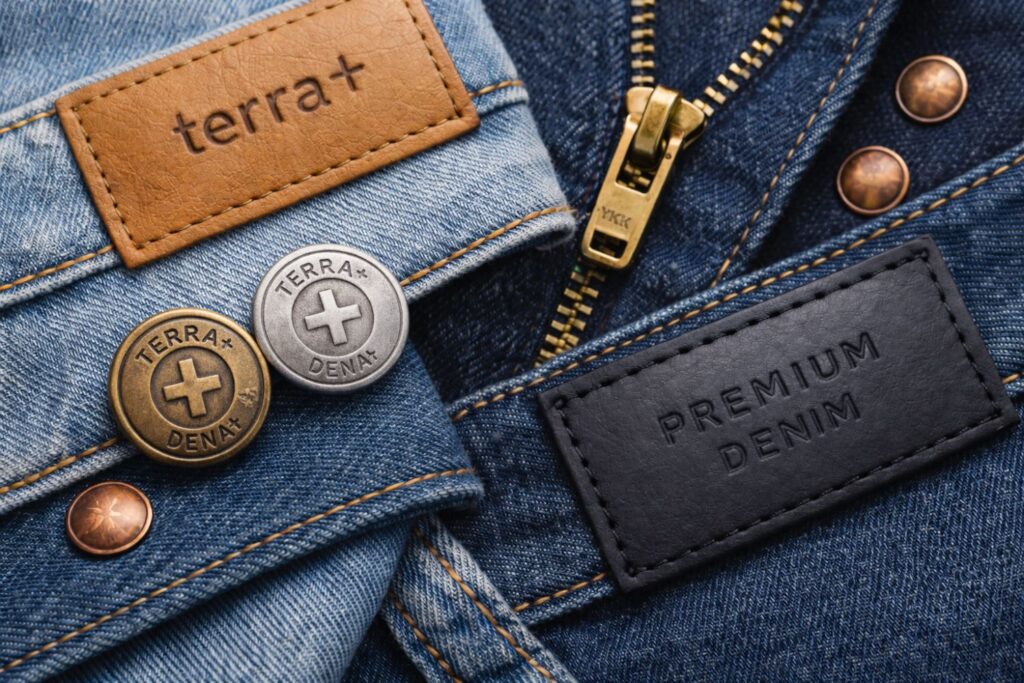 Buttons, zips, patches, and embossed labels.